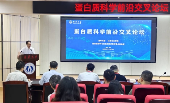 王利华在致辞中对与会专家的到来表示热烈欢迎,并介绍了南华大学的发展概况。他指出,南华大学始终立足地方、服务国家战略,以建设“特色鲜明的高水平大学”为目标,紧密围绕国家核工业战略和健康中国需求,深化产教融合,推动学科交叉创新,为高等教育强国和现代化新湖南建设贡献智慧与力量。他希望以此次论坛为契机,进一步加强与各高校及科研机构的合作,共同推动蛋白质科学领域的发展。