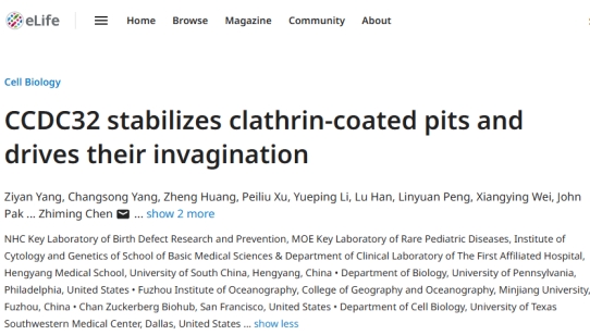 近日,南华大学陈志明教授团队在生物医学领域顶刊 eLife 发表题为“CCDC32 stabilizes clathrin-coated pits and drives their invagination”的研究论文,揭示了一个功能未确定蛋白CCDC32参与调控网格蛋白介导内吞作用的分子机制。南华大学细胞与遗传研究所硕士研究生杨紫雁为第一作者,南华大学陈志明教授为本文通讯作者。
