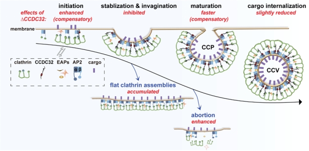网格蛋白介导的胞吞作用(clathrin-mediated endocytosis,CME)是真核生物特异性胞吞大分子物质的主要途径,其功能紊乱与神经退行性疾病、心血管疾病、癌症等密切相关。CME起始于网格蛋白在细胞质膜上组装形成网格蛋白包被小窝(clathrin-coated pits, CCPs),进而内陷闭合并脱离质膜形成包裹着货物的网格蛋白包被囊泡(clathrin-coated vesicles, CCVs)。CCP能否内陷是这一复杂多步骤过程的关键环节,但其驱动机制长期不明,其中功能未确定蛋白CCDC32的作用机制更是所知甚少。