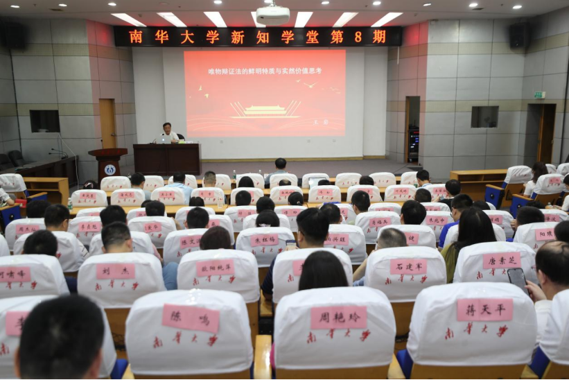 5月22日晚,南华大学新知学堂2024年第8期在红湘校区图书馆开讲。教育部“长江学者”特聘教授、国家级教学名师、南京航空航天大学马克思主义学院王岩教授应邀来校,以“唯物辩证法的鲜明特质与实然价值思考”为题为在场师生作学术报告。校党委副书记雷小勇主持报告会。