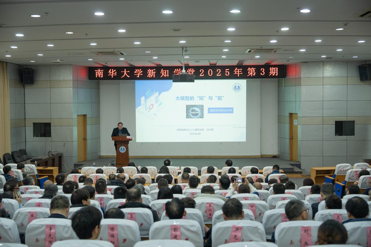 3月12日晚,南华大学新知学堂2025年第3期在红湘校区图书馆一楼新知学堂举行。南华大学网络信息中心主任刘志明教授以“大模型的‘知’与‘能’”为题,为在场干部作专题报告。校党委委员、副校长陈国民主持报告会。全体在校校领导、党委委员出席。